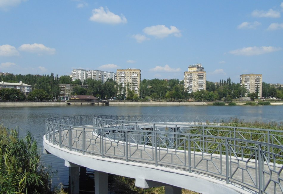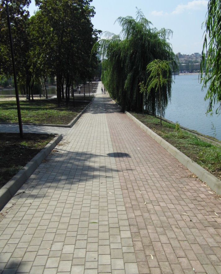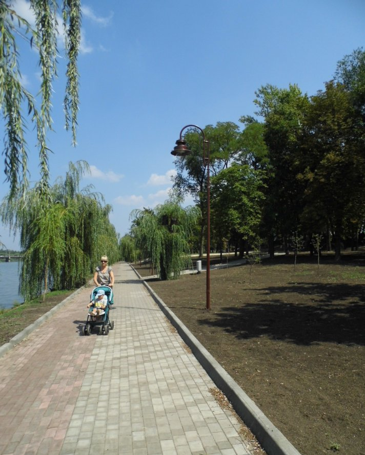 В Калининском районе Донецка полным ходом идёт реконструкция набережной на участке между бульваром Шевченко и проспектом Ильича. В парковой зоне уложили тротуарную плитку на которой обустроили велодорожку, смонтировали кованые электрофонари, поставили урны, до лавочек дело ещё не дошло.