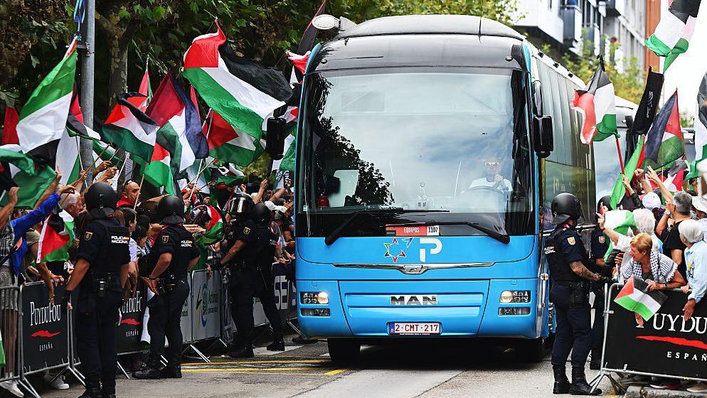 Протестующие, размахивая палестинскими флагами, сорвали этап перед подъемом на Англиру, затронув ведущих гонщиков Джефферсона Сепеду, Боба Юнгельса и Нико Винокурова.