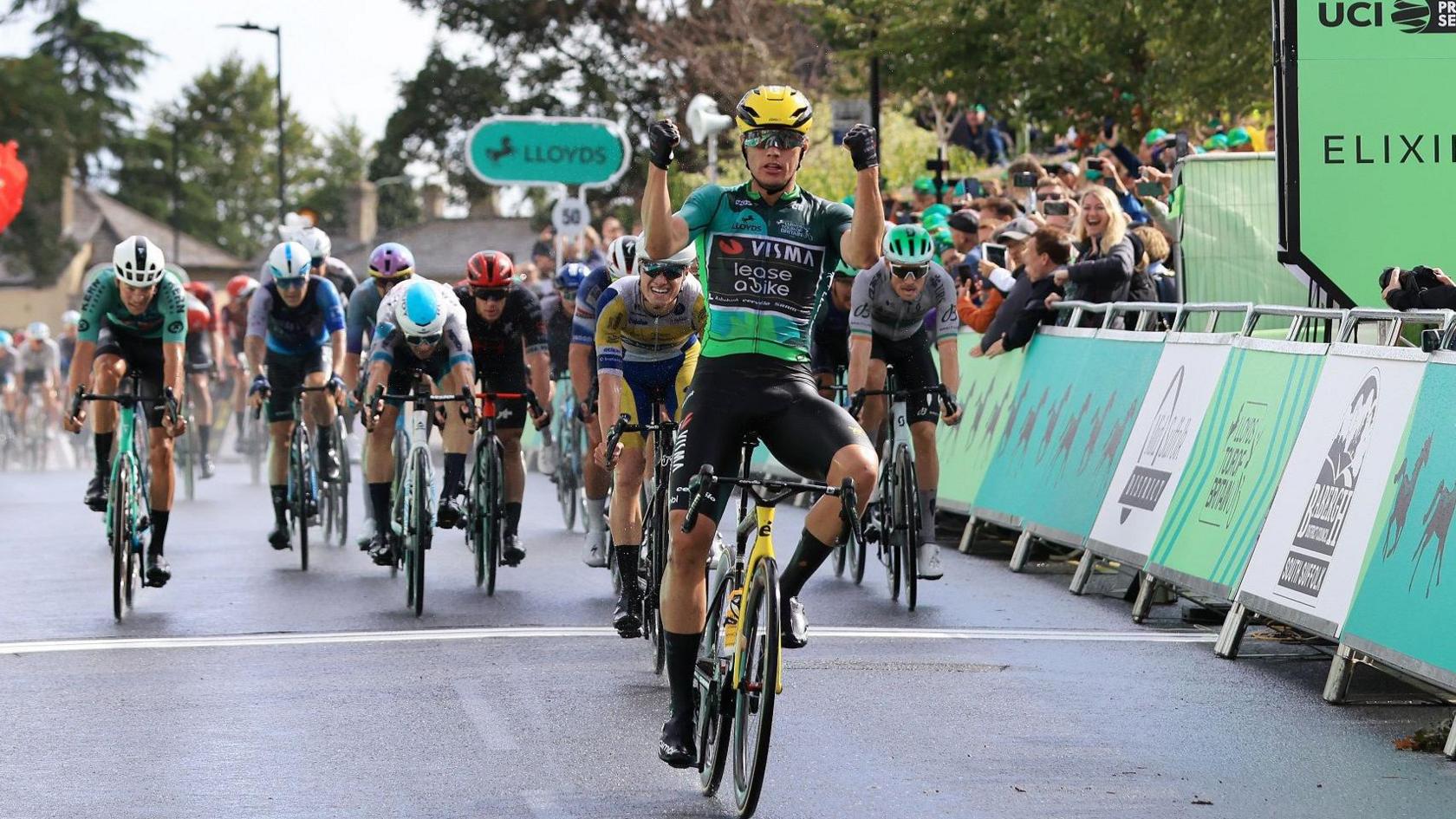 The Team Visma-Lease a Bike rider went around the outside of Great Britain’s Sam Watson on the final corner on the way to win the 174.06km stage in wet weather around Stowmarket.