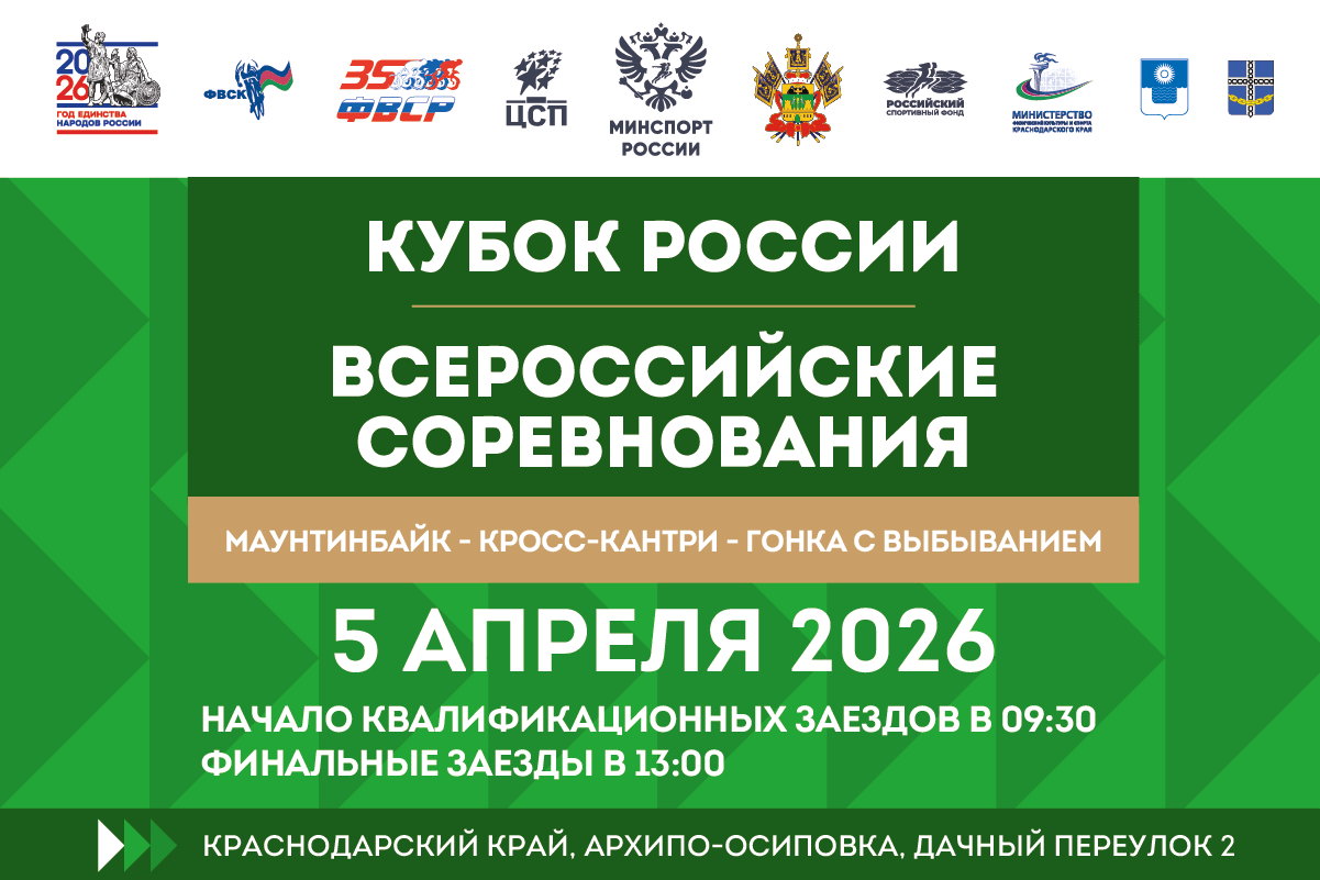 В Архипо-Осиповке Краснодарского края, 5 апреля состоится финал Кубка России по маунтинбайку в гонке с выбыванием и Всероссийские соревнования. Все внимание будет приковано к сильнейшим в этой дисциплине, а также к победителям первого этапа Кириллу Баданину и Александре Ушаковой! ПРОГРАММА: